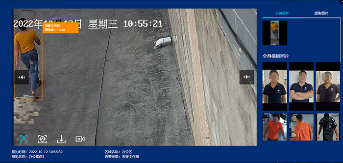 Work clothes detection: Detect the situation where work clothes are not worn in the picture, provide location information, as shown in the alarm for not changing work clothes after entering the factory area;