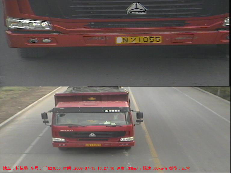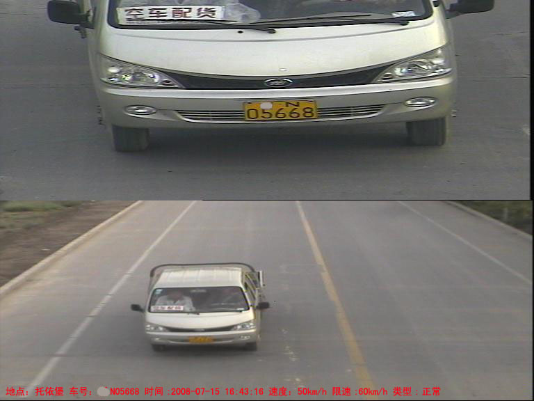 The system captures images of each vehicle passing through the detection coil, including two color images: a feature image (front close-up) and a panoramic image of the vehicle. The resolution of each image is 768 * 288, with 24 bit true color. In captured images, the system can overlay the basic information of the detected vehicle, such as date, time, location, direction, license plate number, vehicle speed, vehicle type (suspected, speeding, normal), etc., on the panoramic image, making it easy for manual discrimination and post evidence collection.